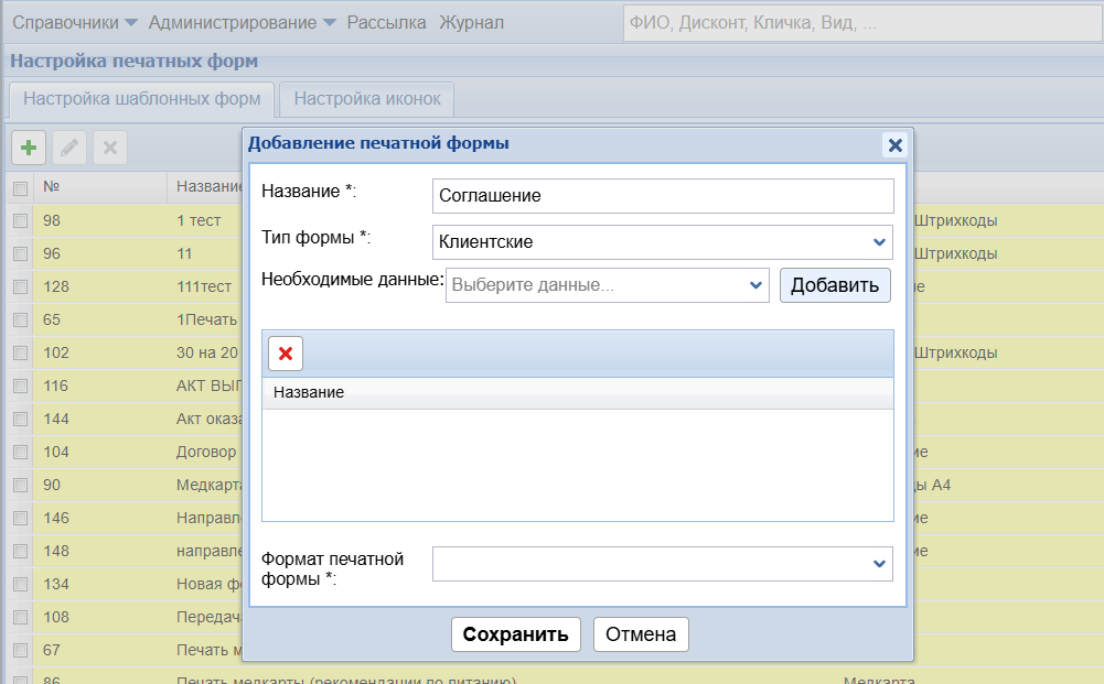 3. Поле Необходимые данные определяет, какие данные из программы будут использованы в шаблоне для печати. Например, для распечатки лечебной карты питомца необходимы данные доктора и клиента. Поэтому при создании такой лечебной формы нужно выбрать каждое значение из списка необходимых данных и нажать кнопку Добавить