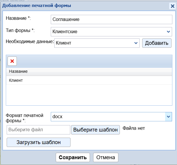 Для подключения шаблона к программе нужно нажать кнопку Выберите шаблон, указать путь к созданному ранее шаблону на локальном компьютере и нажать кнопку Загрузить шаблон. После этого нажать Сохранить.