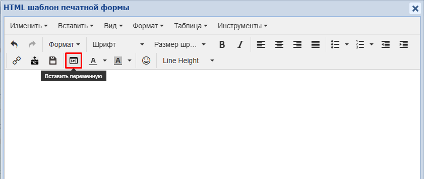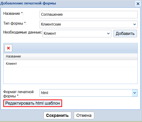 HTML формат указывается, если форма будет создаваться в html. При этом снизу появляется кнопка Редактировать html шаблон. При ее нажатии появится окно с визуальным редактором, в котором можно создать, редактировать и сохранить печатную форму наглядно.