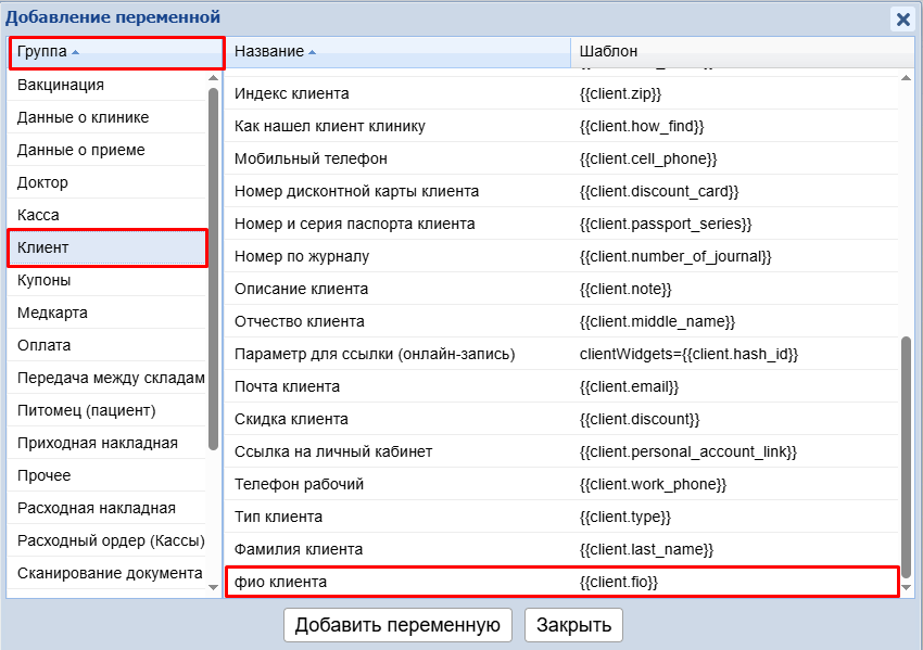 Переменные разделены на группы. Например, для добавления ФИО клиента нужно выбрать группу КЛИЕНТЫ и найти соответствующую переменную. Нажмите Добавить переменную.