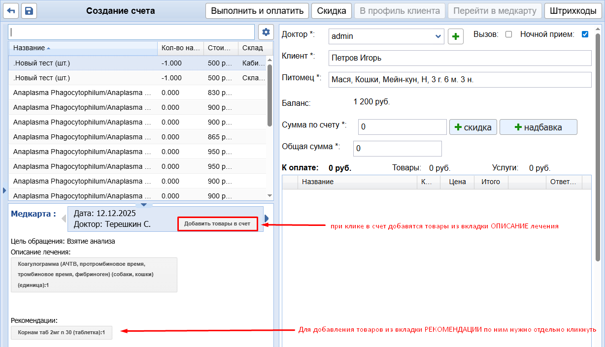Через кнопку "Добавить товары в счет" будут добавляться товары, которые добавлены во вкладку "Описание лечения". Товары из вкладки "Рекомендации" будет доступны для добавления вручную.