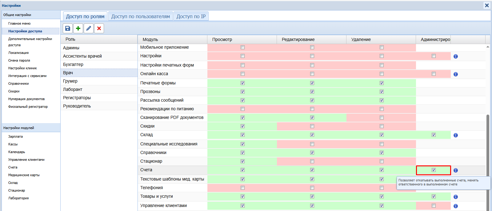 Если у вас неактивна кнопка "Откатить", проверьте наличие доступа на откат: Настройки - Настройки доступа - галочка "Администрирование" в разделе счета. Проверить/настроить такой доступ может сотрудник с ролью "Админы" в программе или с доступом к настройкам.