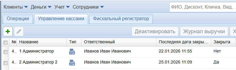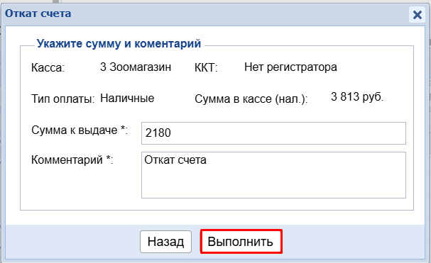 Если у вас нет выбора кассы при откате, значит, вы не являетесь ответственным ни за одну из касс. Обратитесь к ответственному за кассу, чтобы он откатил счет. Проверить, кто ответственный, можно в модуле Кассы - вкладка "Управление кассами"