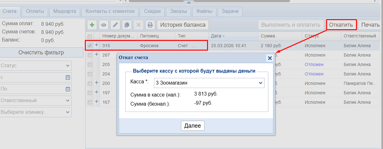 Как исправить выполненный счет: как изменить питомца, доктора, сумму или тип оплаты (наличными или безналичными). Что делать, если клиент хочет вернуть купленный товар.