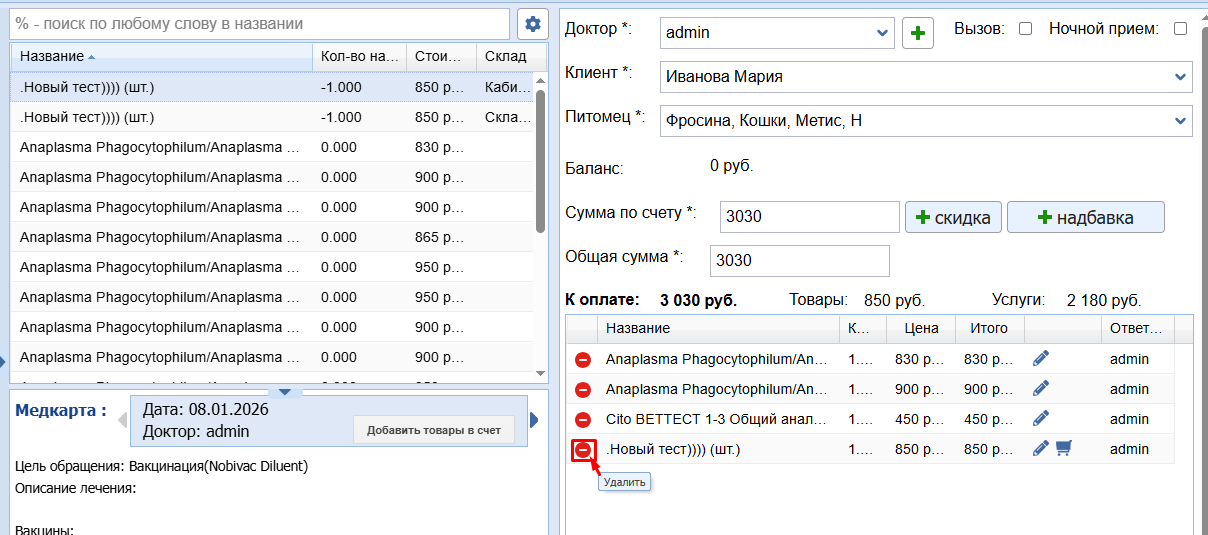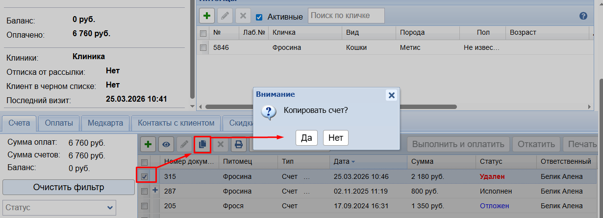 Изменить ответственного доктора или питомца в выполненном счете