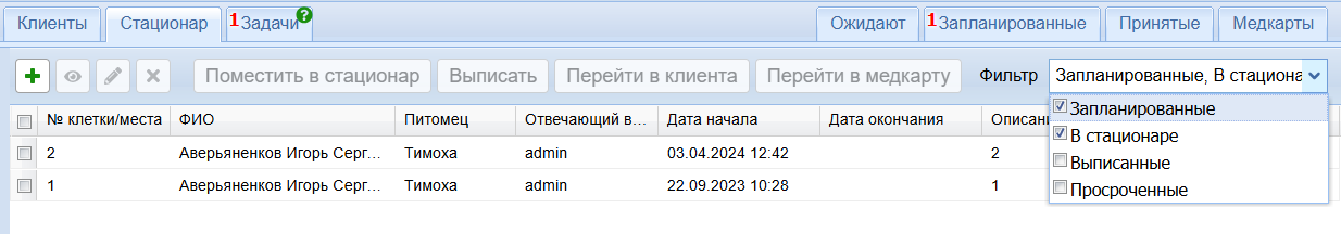 Выписанных питомцев можно увидеть, выбрав в фильтре статусов записей стационара значение Выписанные.
