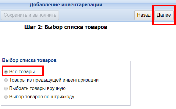 Если нужно провести полную инвентаризацию, выберите пункт Все товары и нажмите кнопку Далее.