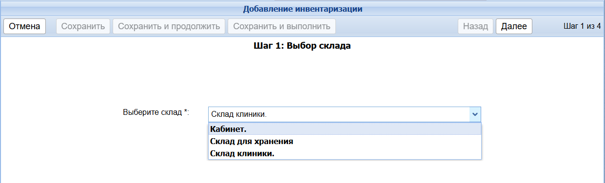 В открывшемся окне выберите склад, по которому проводите инвентаризацию, и нажмите кнопку Далее.