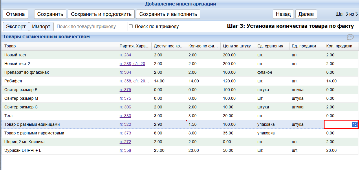 В столбце Количество продажи отобразится остаток товара в выбранных единицах. Посчитайте фактическое количество товара именно в этих единицах и укажите его в поле Кол-во продажи.