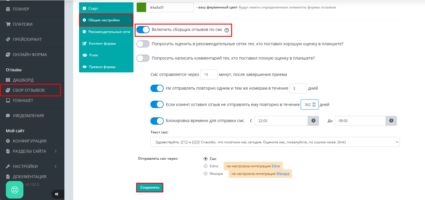 В виджете переходим в Сбор отзывов - Общие настройки - нажимаем Включить сборщик отзывов по смс. И делаем настройку, когда отправлять смс клиенту