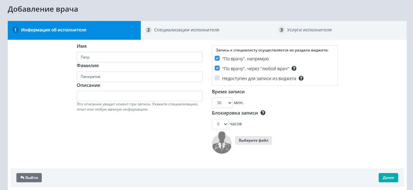 Чтобы добавить нового врача в виджет записи на прием, нужно нажать кнопку Добавить исполнителя.