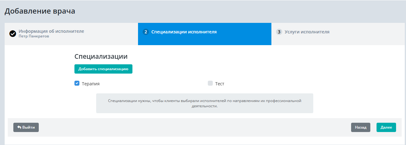 На следующем шаге можно добавить специализации врачу (это направления их профессиональной деятельности). Например, хирургия, дерматология, УЗИ диагностика, кардиология, терапия и т.д.