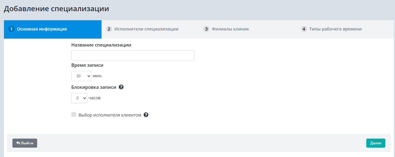 Заполните необходимые данные, отметьте врачей, которые предоставляют услуги в данном виде специализации, выберите филиалы и типы рабочего времени.