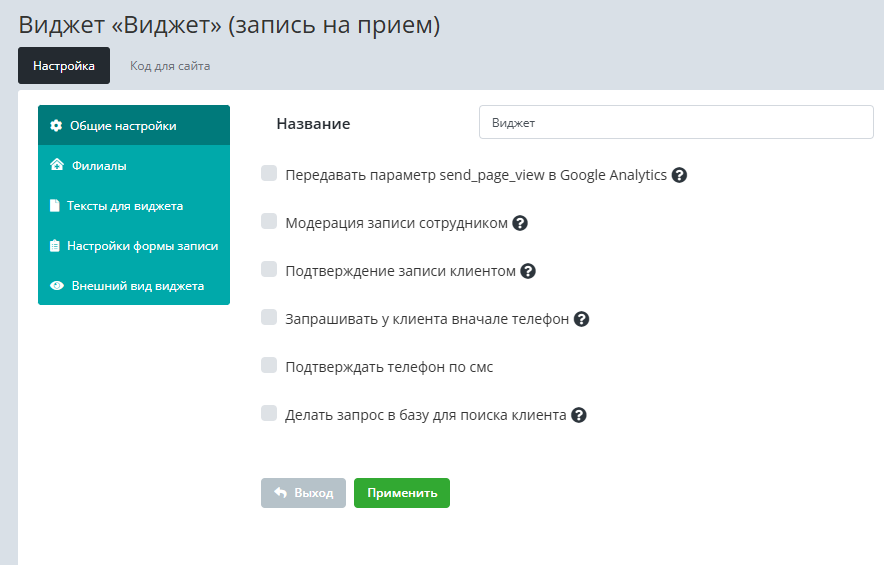 В разделе Код для сайта — будут предложены скрипты кнопки записи на прием. Скопируйте строку скрипта и разместите на ее на сайте или другом ресурсе.