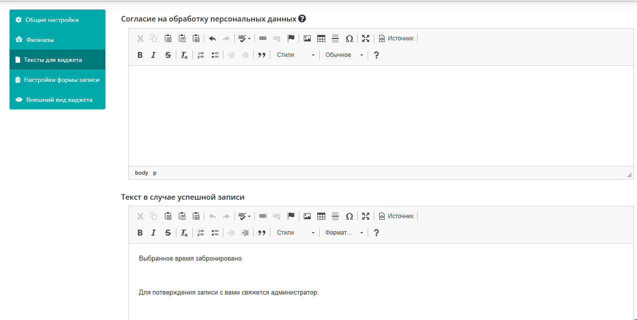 Здесь будет согласие на обработку персональных данных и текст, который увидит клиент после успешной записи на прием.