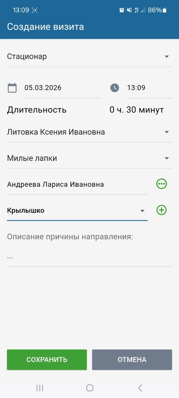 Чтобы создать визит, нужно нажать кнопку с зеленым плюсом.