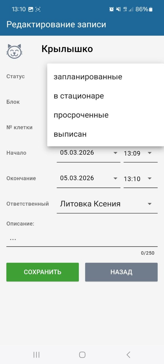 Из приложения можно поместить питомца в Стационар. Для этого необходимо: