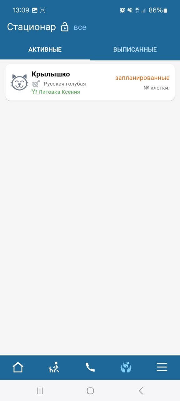 Следующая кнопка открывает вкладку Стационар. Здесь есть информация о питомцах, которые сейчас в стационаре и выписанные из него.