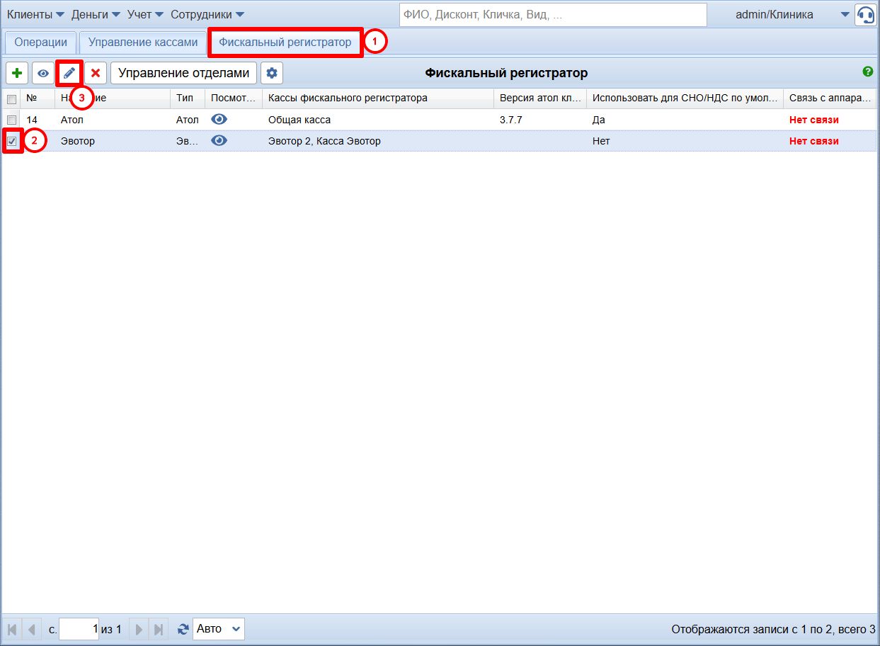 Для настройки разрешительного режима на кассах Атол/Эвотор прейдите в Кассы - вкладка Фискальный регистратор - выделите строку с фискальником и нажмите карандаш.