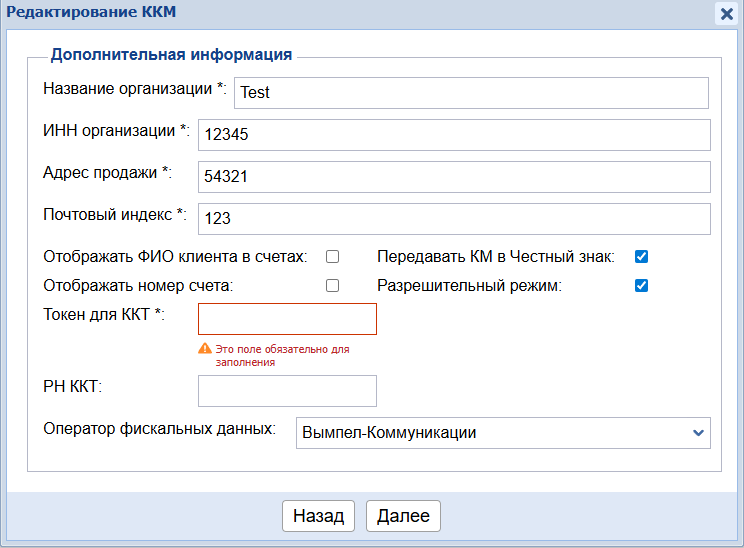 | На первой же странице откроется окно для заполнения данных. Галочка "Разрешительный режим" по умолчанию скрыта. Чтобы галочка стала видимой, активируйте чекбокс “Передавать КМ в Честный знак”. | Если у вас АТОЛ, данная настройка будет на следующей странице. Нажмите Далее. Чтобы галочка "Разрешительный режим" стала видимой, активируйте чекбокс “Передавать КМ в Честный знак”. |