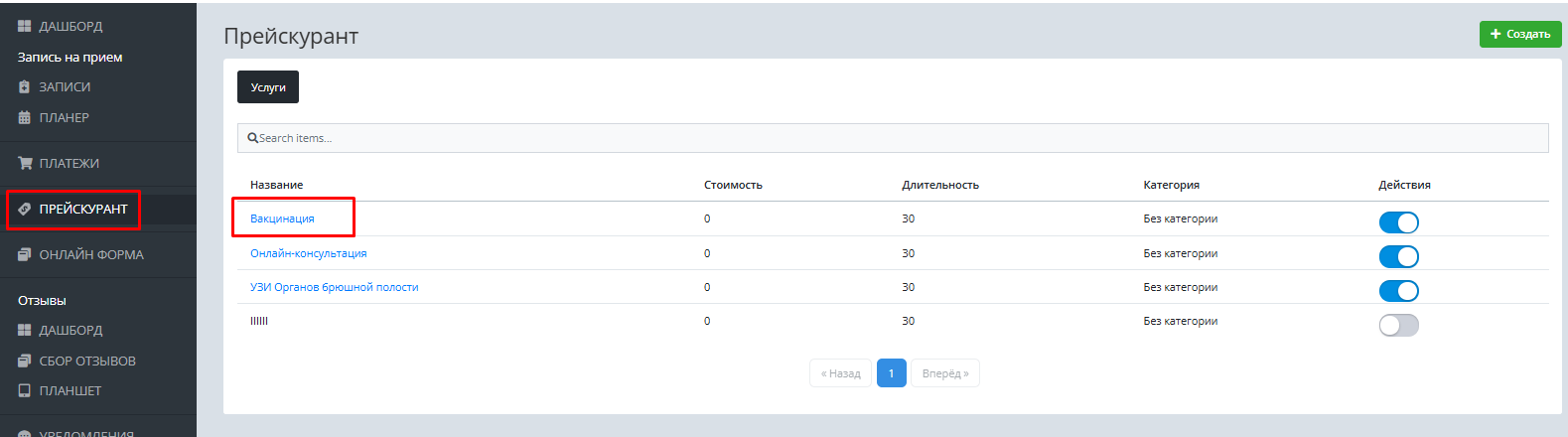 Далее в виджете необходимо перейти в Прейскурант выбрать необходимую услугу и перейти в ее настройки (кликнув по названию).