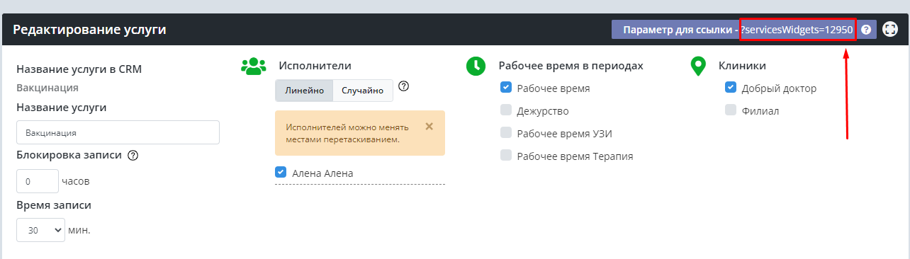 Этот параметр необходимо добавить к общей ссылке на онлайн-запись и таким образом получится ссылка на запись на конкретного исполнителя.