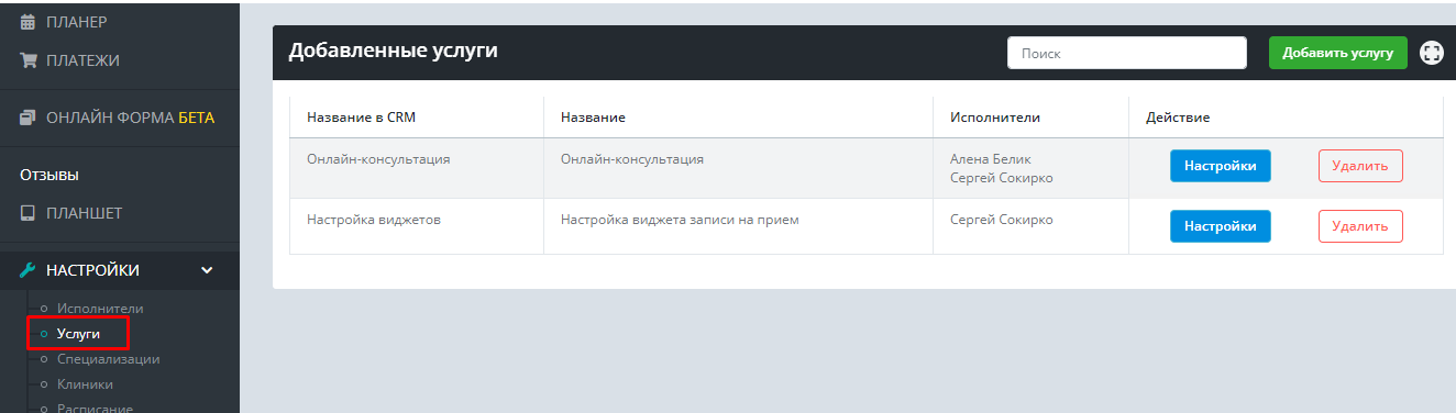 Когда методы оплаты настроены, чтобы настроить онлайн-оплату за услугу в виджете необходимо перейти в раздел Настройки — Услуги. Найти услугу, за которую нужно принимать онлайн-оплату, и зайти в ее Настройки