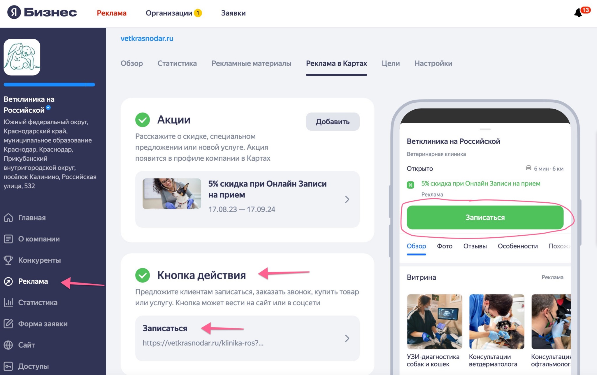 Также обратите внимание, что если вы включите рекламу от Yandex, у вас появится возможность управлять тем, что вы хотите показывать (например, телефон клиники или кнопку «Записаться на прием», которая ведет на вашу онлайн запись).