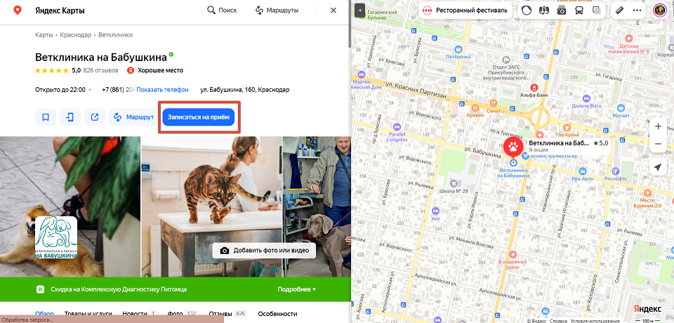 На Yandex-картах клиент находит информацию о клинике и нажимает Записаться на прием.
