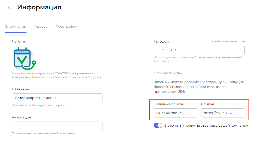 В личном кабинете UDS в профиле компании в блоке "Главная кнопка" вставьте эту ссылку под названием “Онлайн запись”
