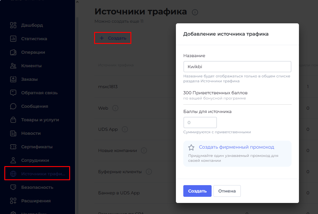 - Перейдите в раздел "Источники трафика" в UDS.