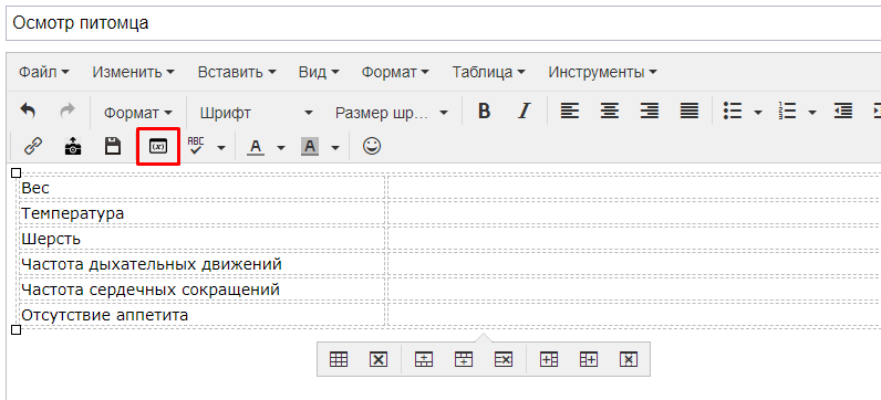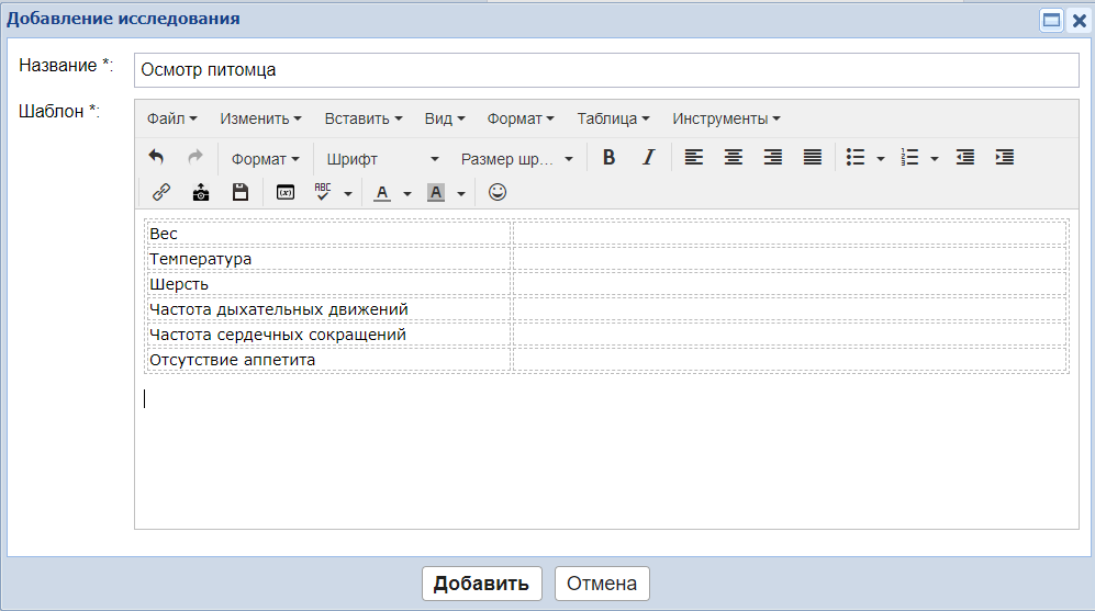 | При наличии нескольких медкарт с данным шаблоном с помощью отчета можно будет посмотреть динамику показателей питомца. Как создавать такие отчеты, описано здесь. |