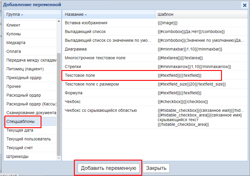 Выбираем Спецшаблоны → Текстовое поле →Нажимаем кнопку Добавить переменную