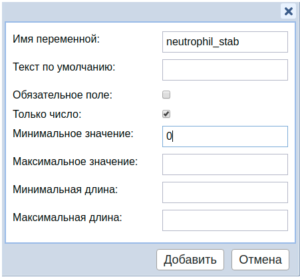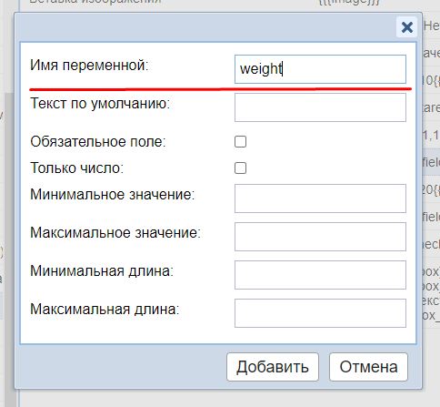 Заполняем форму: обязательно вводим имя переменной, ставим галочку Только число. Остальное по необходимости. Нажимаем Добавить