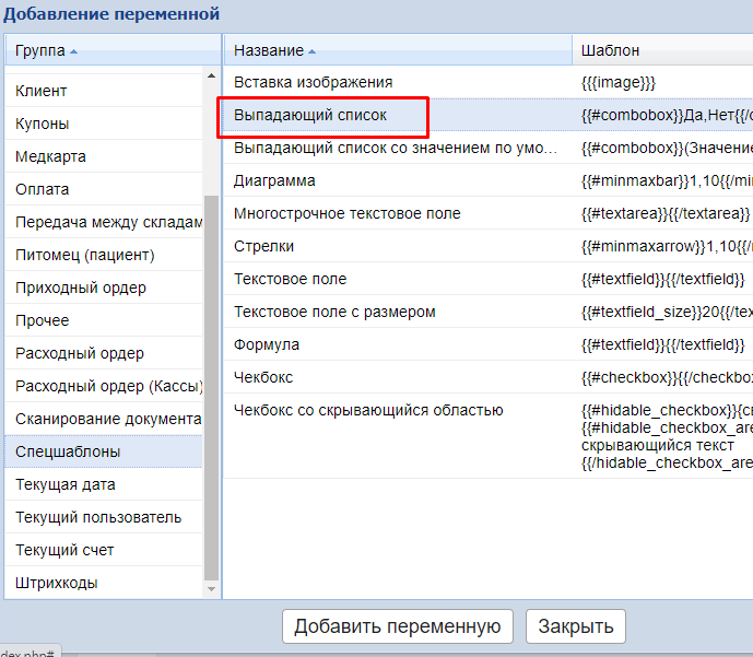 Выбрать переменную — Спецшаблоны — Выпадающий список — Добавить переменную