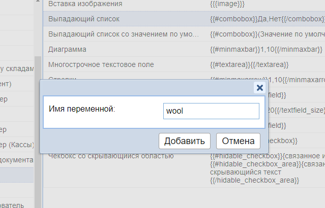 Поставим курсор в место добавления переменной и нажмем Вставить переменную