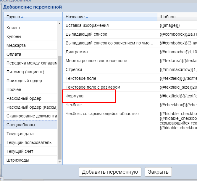 Нажать Вставить переменную — Спецшаблоны — Формула — указать имя переменной — заполнить поле Формула.