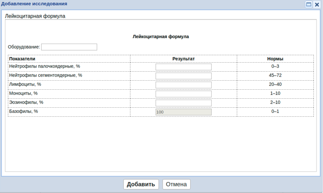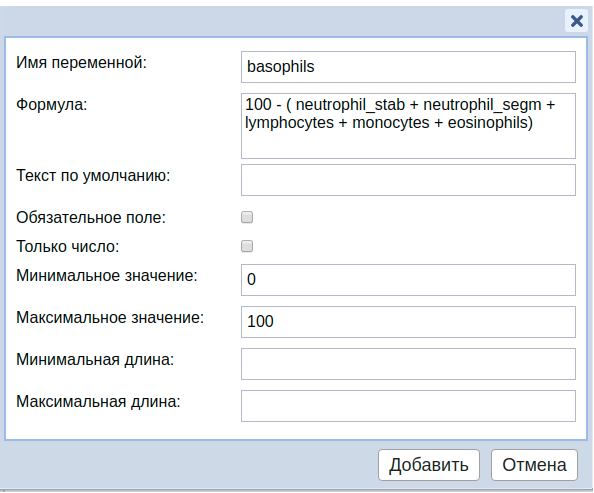 Мы знаем, что общий процент этих показателей должен составлять 100%. Для этого переменную последнего показателя мы создадим как формулу. Это позволит лаборанту вовремя заметить ошибку при введении данных.
