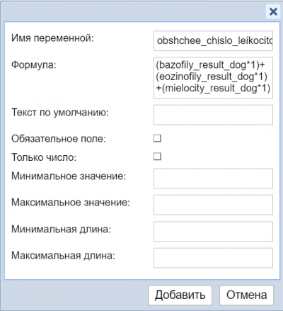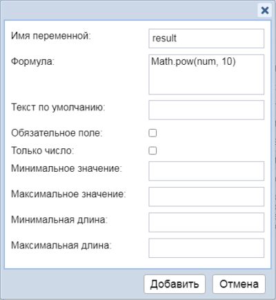 Заполняем форму: обязательно вводим имя переменной и формулу, а остальное заполняем по необходимости. Нажимаем Добавить.