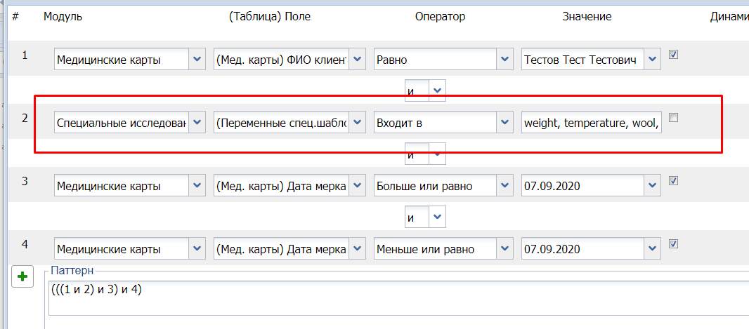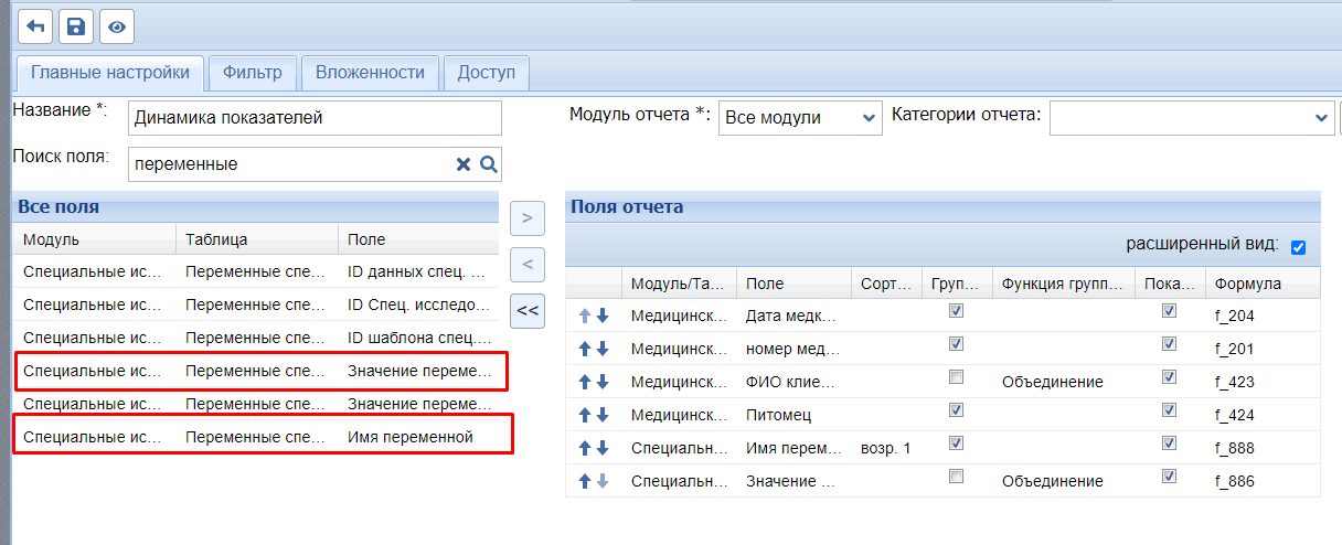 Чтобы построить такой отчет по показателям, нужно перейти в модуль Конструктор отчетов, нажать зеленый плюс, написать название отчета и добавить в отчет нужные поля из таблицы Мед.карты (например: фио клиента, кличка питомца, дата и номер медкарты).
