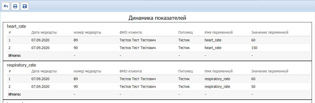 При наличии нескольких медкарт с данным шаблоном с помощью отчета можно будет посмотреть динамику показателей питомца.