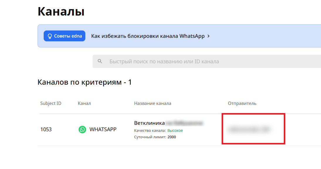 После создания канала необходимо вставить API ключ и имя отправителя в настройках интеграции edna в виджете по ссылке