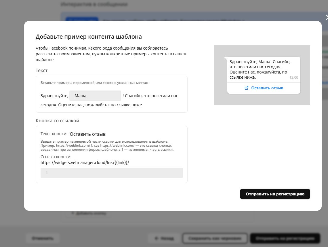 Нажмите «Отправить на регистрацию», после в появившемся окне вставьте пример текста – «Маша» и пример переменной – «1».