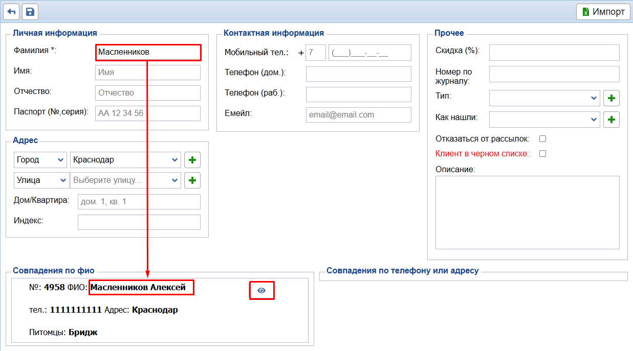 При добавлении нового клиента Ветменеджер автоматически проверяет данные по ФИО и телефону и показывает возможные совпадения.