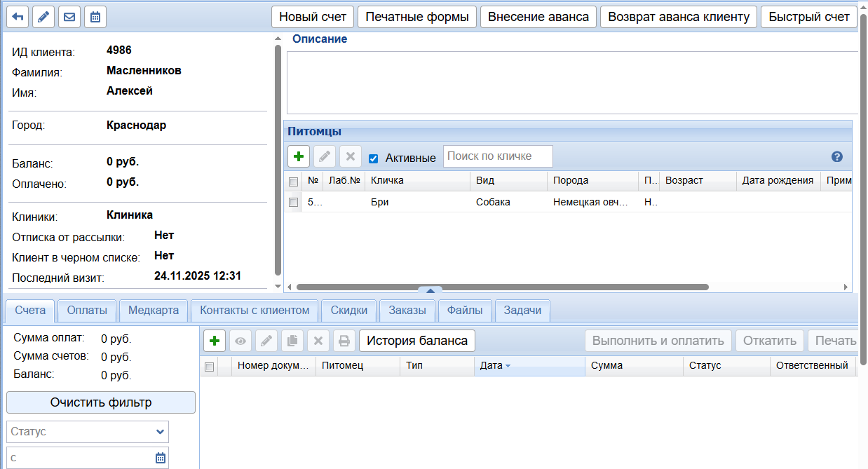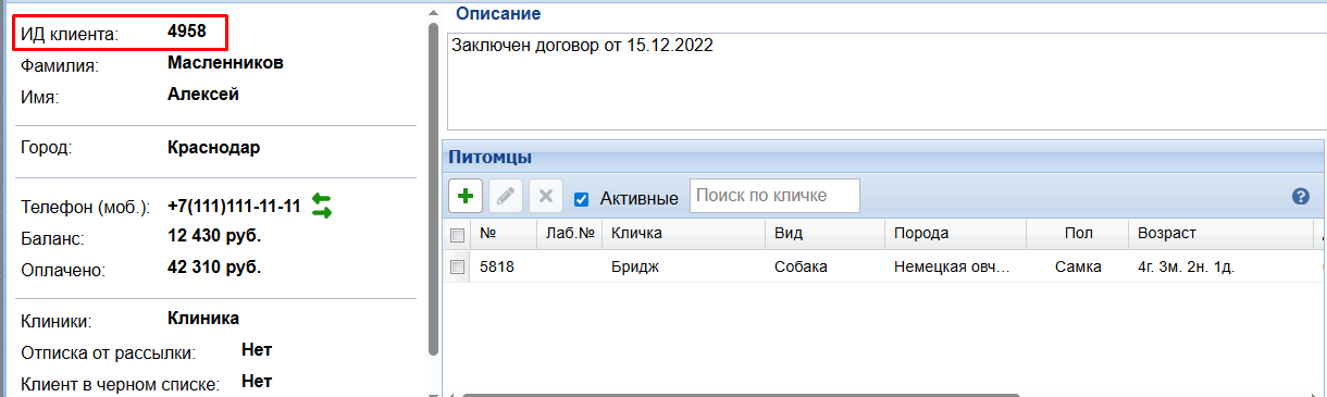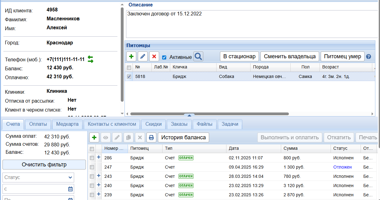 Клиент с той же фамилией, но есть счета, полностью заполнена информация о питомце.